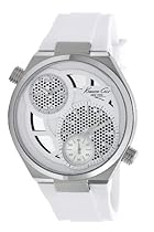 A high-concept highly functional and stylish timepiece the Kenneth Cole New York Men's Analog Dual Time Silver Dial Watch features two analog faces on its white and mirrored textured dial. The bigger of the two analog faces boasts silver-toned baton hour markers and luminous silver-toned hands and resides at the dial's four o'clock position. Its respective crown is featured at the four o'clock position on the outside of the watch's silver-toned stainless steel case. The smaller of the two analog faces is featured at the ten o'clock position and sports Arabic hour markers and luminous silver-toned hands. Its respective crown is featured at the ten o'clock position on the outside of the watch's silver-toned stainless steel case. The dial also features an additional subdial at the five o'clock position and the entire dial comes protected by a mineral crystal. Other features include a white silicone strap that closes with a traditional buckle analog quartz movement a stainless steel silver-toned bezel and water resistance to 99 feet (30 meters).